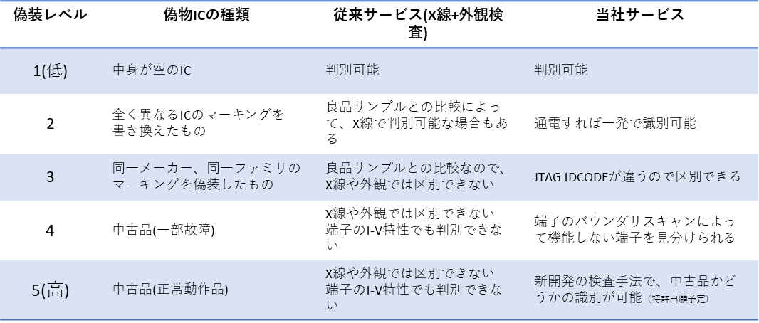 偽物ICの種類と、従来から行われている検査方法、それから当社サービスによる検査方法を下の表に示します。